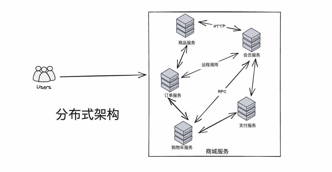 分布式就是把一个集中式系统拆分成多个系统,每一个系统单独对外提供部分功能,整个分布式系统整体对外提供一整套服务。对于访问分布式系统的用户来说,感知上就像访问一台计算机一样。