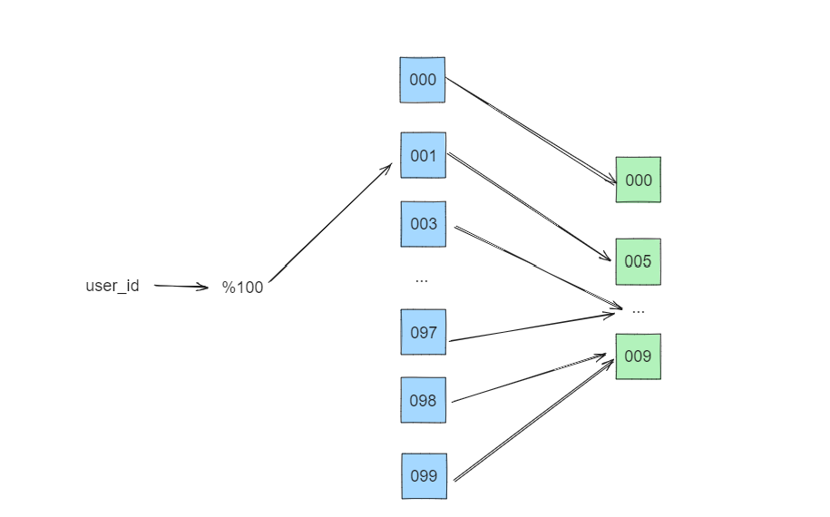 当一个数据项需要被存储时,我们首先根据某个键(比如用户ID)对100取模,决定将这个数据项放到哪个虚拟分片中。然后,这个虚拟分片会根据预先定义的映射关系被映射到一个物理分片上。这样,即使某些用户ID段的数据特别多,通过虚拟分片和映射也能较均匀地分布到所有的物理分片上。