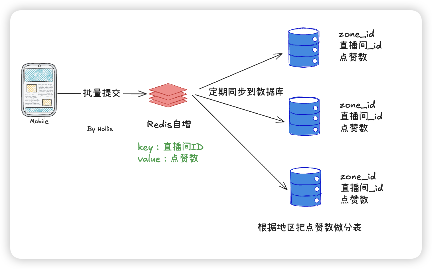 以下就是个最完善的点赞场景的数据更新方案,结合了批量提交、Redis存储以及数据库拆分的方案。