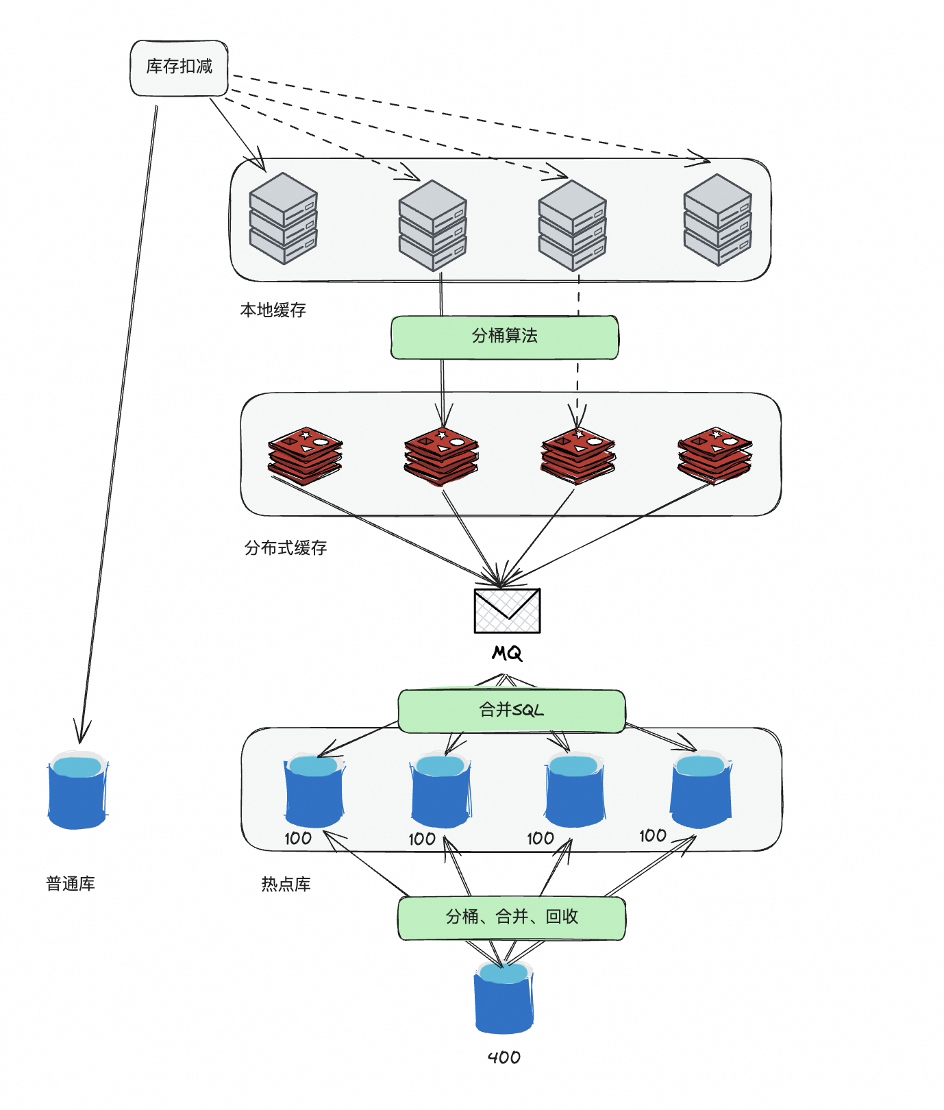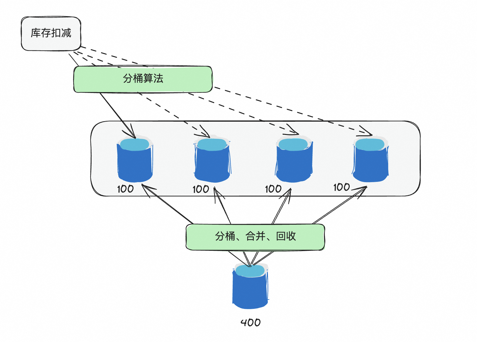 但是如果有些场景的QPS达到数万级别了,只靠数据库肯定是不行了。于是有一些营销平台或者额度系统,就会采用分桶的策略。就是将单个1000的库存拆分成10个100的库存,这样就可以把并发提升10倍。当然,这里还需要考虑如何均匀分配,如何解决碎片,如何做分桶间调度以及如何做动态扩容等问题。然后有些团队就专门研发了库存调度系统来解决这些问题。