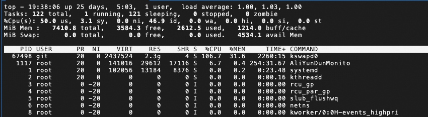 首先看下这个程序是不是已经在跑了,top看下运行的进程,发现有一个kswapd0进行耗CPU比较高,这个进程本身是个linux的后台进程,负责内存交换的,但是熟悉的都知道,他其实是个老演员了。