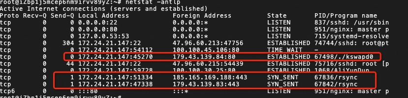 不查不知道,一查就发现了老朋友。通过netstat发现一个瑞士的IP在和kswapd0通信,同时有两个一个罗马尼亚的ip在和rsync这个数据传输进程在不断通信。