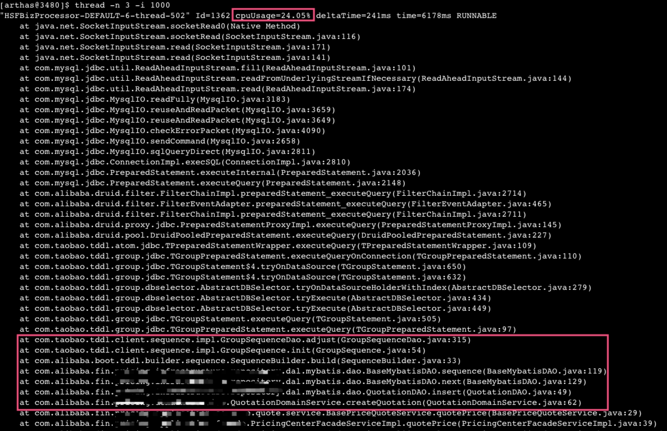通过分析调用链,发现这个地方是我代码中有数据库的insert,并且使用TDDL来创建sequence,在sequence的创建过程中需要和数据库有交互。