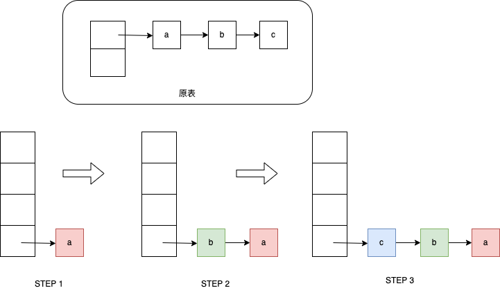 通过上面的代码我们可以看到,这种做法不仅需要遍历老桶中的链表,还需要遍历新桶中的链表,时间复杂度是O(n^2),显然是不太符合预期的,所以需要将rehash的节点作为新桶中链表的根节点,这样就不需要二次遍历,时间复杂度就会降低到O(N)