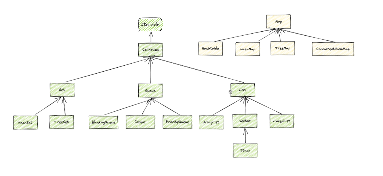 从继承关系上讲,List,Set,Queue都是Collection的子接口,Collection又继承了Iterable接口,说明这几种集合都是可以遍历的。