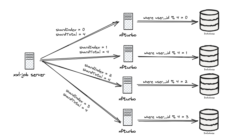 举个例子,如果一共5台实例,那么每台机器的shardTotal都是5,然后他们的shardIndex是从0到4的。这样接收到shardIndex=0的这台机器,就会只处理 userId 的尾号 % 5 == 0的所有用户数据,而接收到shardIndex=1的这台机器,就会只处理 userId 的尾号 % 5 == 1的所有用户数据。。。