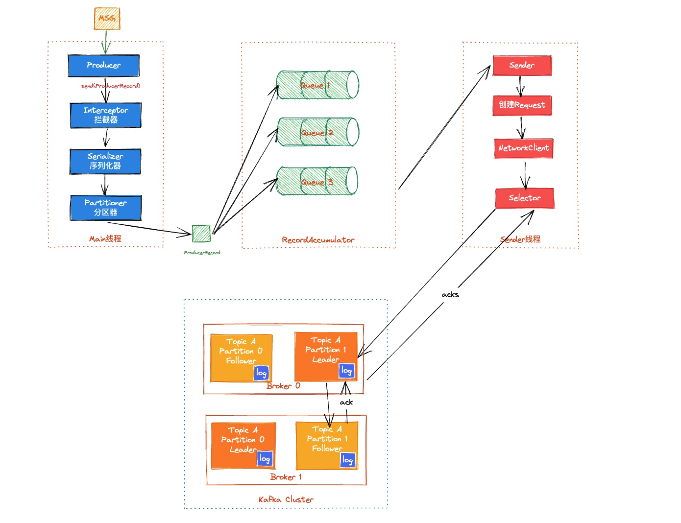 Kafka 的 Producer 在发送消息时通常涉及两个线程,主线程(Main)和发送线程(Sender)和一个消息累加器(RecordAccumulator)