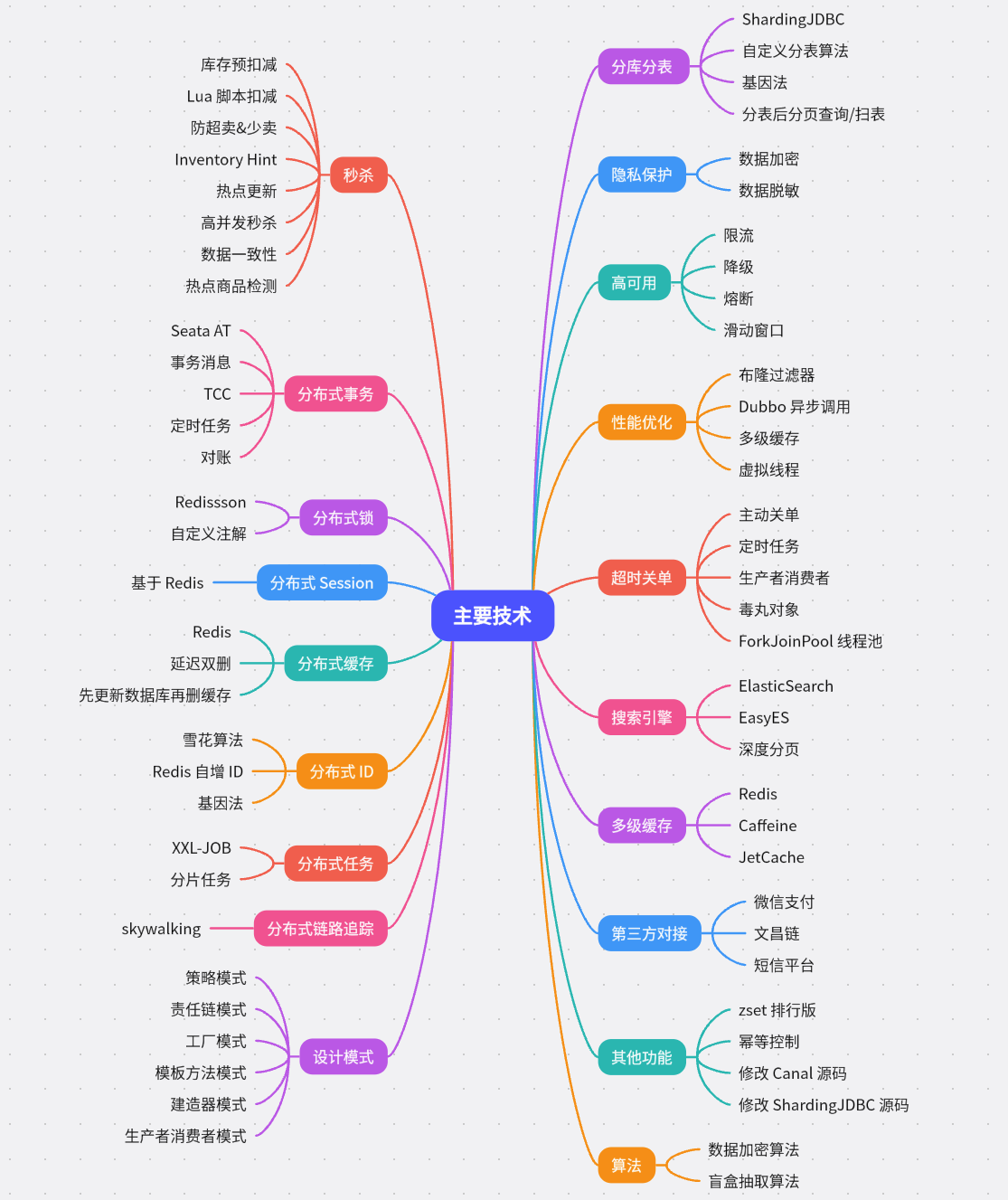 比如分布式事务、分布式 Session、分布式 ID、分布式锁、分布式任务、分布式缓存等等,以及像分库分表、多级缓存、搜索引擎等等。并且实现了很多有难度的功能,如秒杀、关单、排行榜等等很多很多。