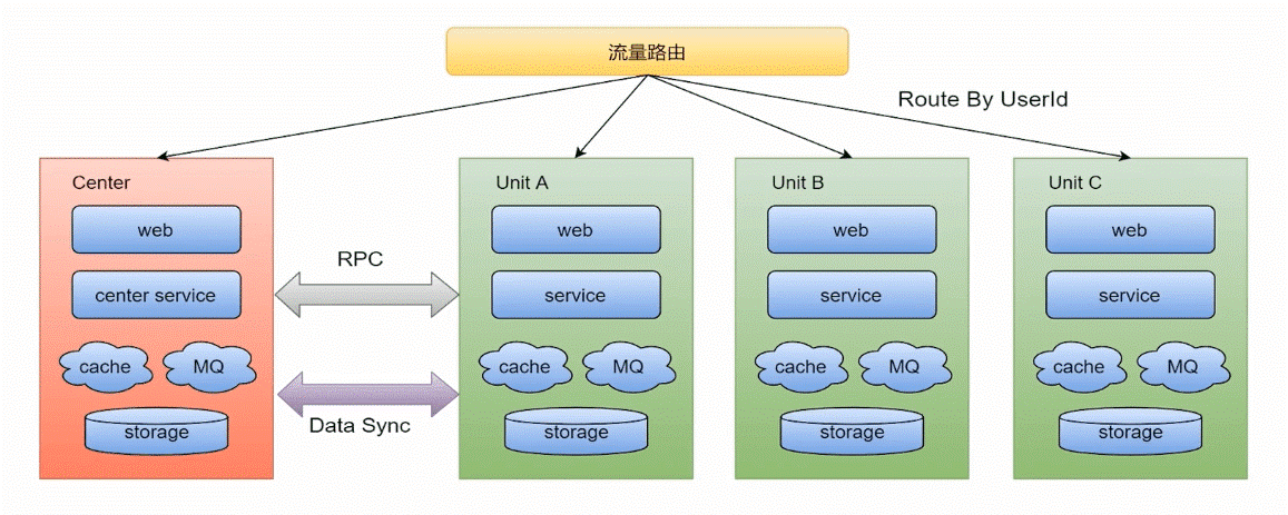 除了单元以外, 一般还有一个中心的概念,中心的数据就是全量的,所有单元的数据的聚合在一起,都存放在中心上,也会有一部分用户可以路由到中心进行业务操作。