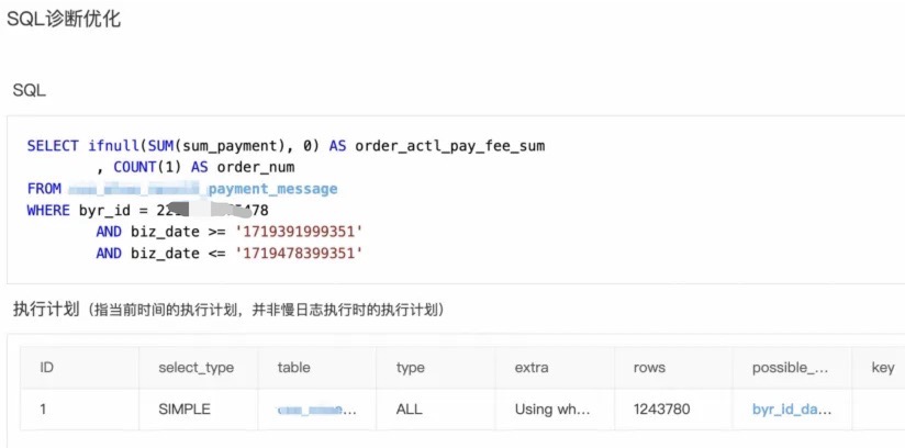 于是继续去排查索引和 SQL 的情况(其实早就应该查这个,只不过前面一直在看为啥同样的 SQL 有的走索引,有的不走),最终发现 SQL 虽然命中了索引,但是还是需要回表,因为我们的索引中只包含了byr_id和 biz_date这两个字段,而 sum_payment 并不在里面,这就意味着每次查询都需要回表。