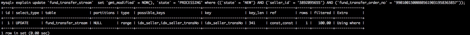 | update fund_transfer_stream set gmt_modified = NOW(), state = ‘PROCESSING’ where ((state = ‘NEW’) AND (seller_id = ‘3111095611’) AND (fund_transfer_order_no = ‘99010015000805619031957477256’)); | 死锁 |