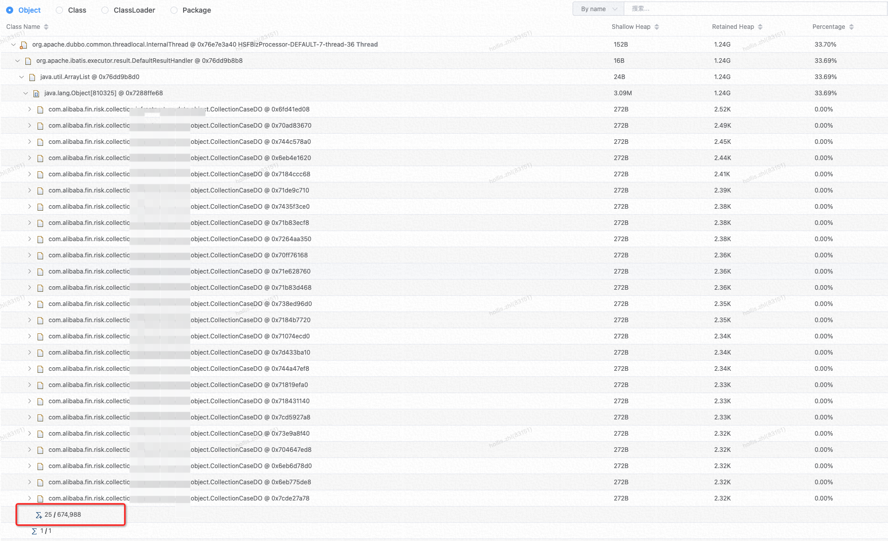 发现有一个ArrayList中存放了60多万个CollectionCaseDO对象。