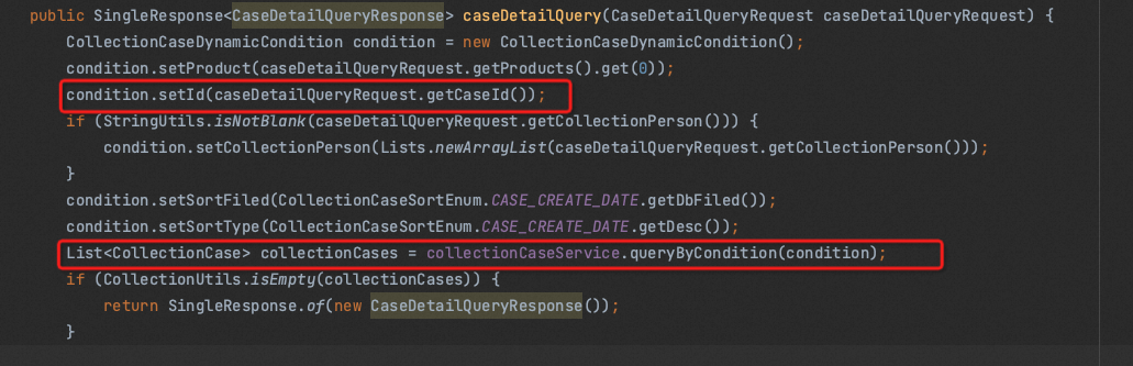 但是上面的问题查询没有带这个ID,那么看了一下代码,这是一个根据ID查询详情的接口,但是发现同事的代码中并没有对这个caseId做非空校验,然后在用户未传递caseId的时候,用了个queryList,就会把所有的案件都查出来放到List中。。。。
