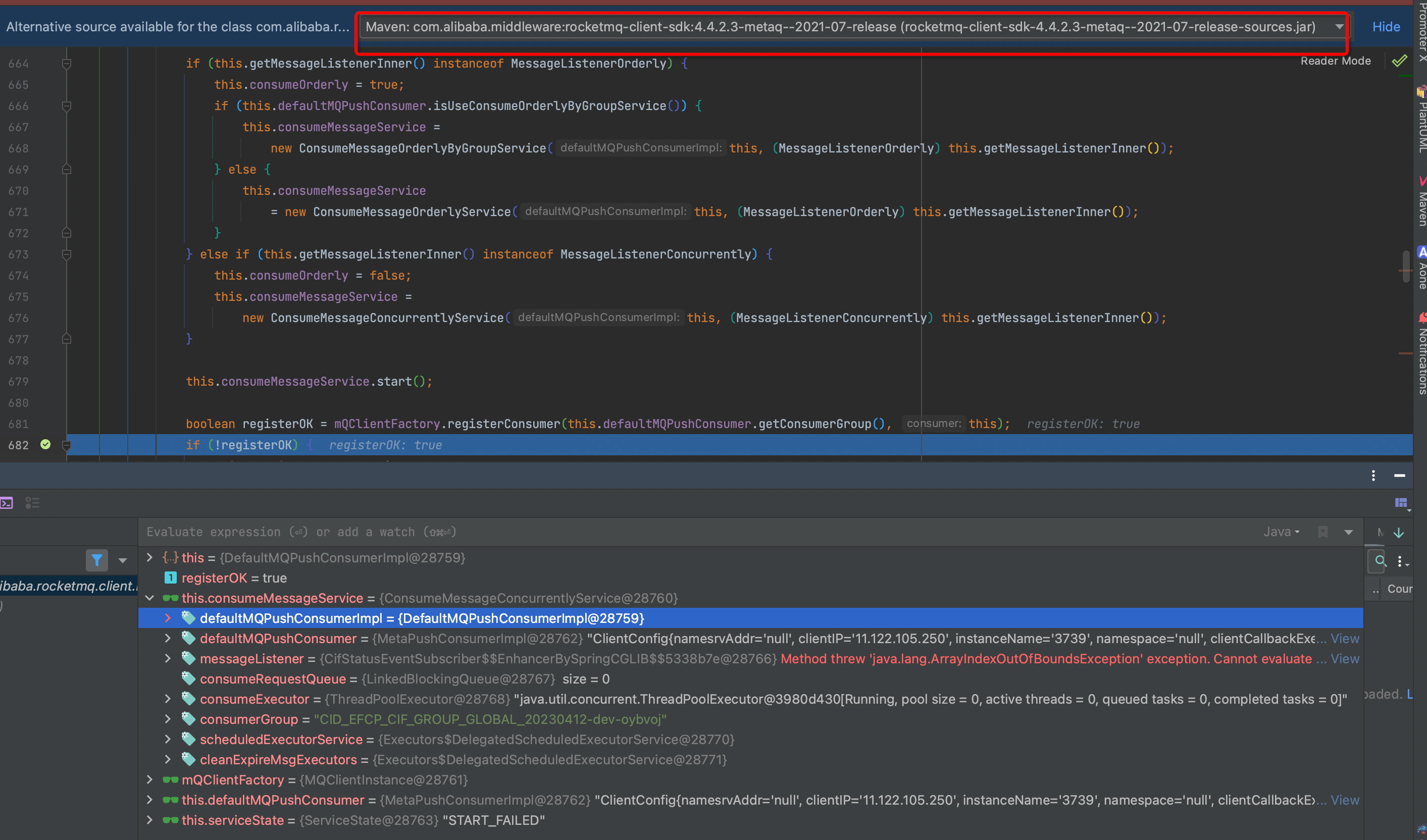 分析到这里,原因就已经很明显了。Spring Cloud Stream会在启动的时候自己new一个MetaPushConsumer(事实上就是一个新的MQConsumerInner),所以对于一个ConsumerGroup来说,就存在了两个MQConsumerInner,这显然是不符合RocketMQ要求的1:1的映射关系的,所以RocketMQ默认会用新的映射代替老的映射关系。显然,Spring Cloud Stream的被RocketMQ原生的给替代掉了。