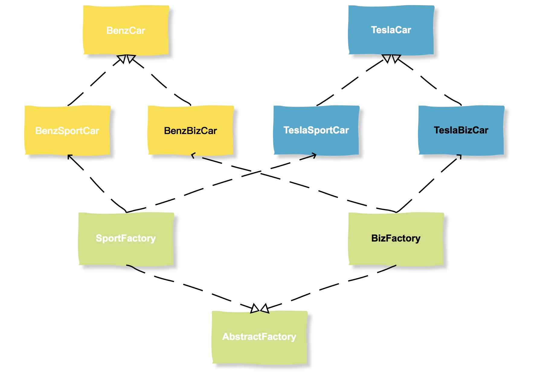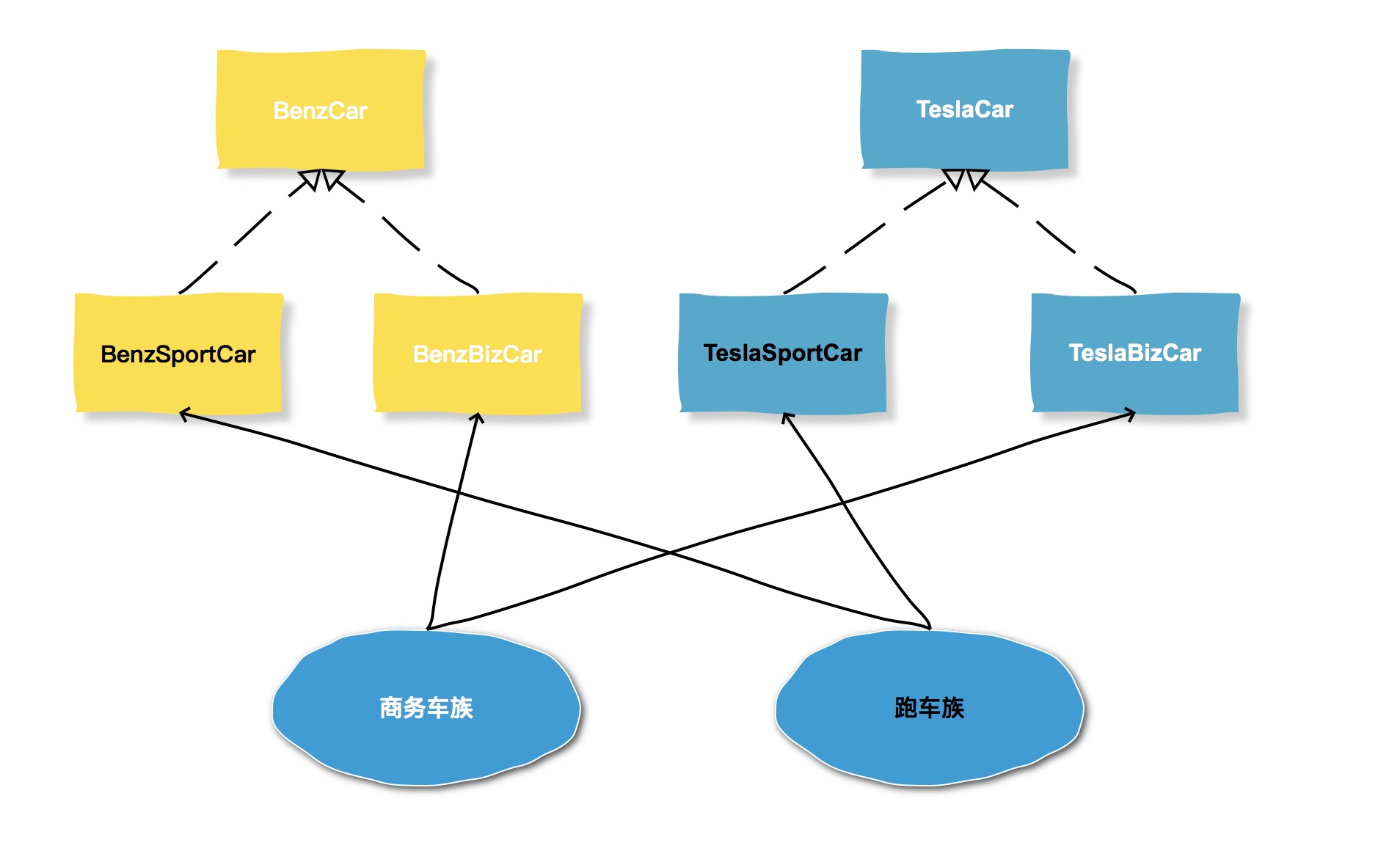 本文的例子采用一个汽车代工厂造汽车的例子。假设我们是一家汽车代工厂商,我们负责给奔驰和特斯拉两家公司制造车子。我们简单的把奔驰车理解为需要加油的车,特斯拉为需要充电的车。其中奔驰车中包含跑车和商务车两种,特斯拉同样也包含跑车和商务车。