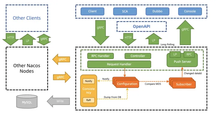 配置管理之前用Http1.1的Keep Alive模式30s发一个心跳模拟长链接,协议难以理解,内存消耗大,推送性能弱,因此2.0通过gRPC彻底解决这些问题,内存消耗大量降低。