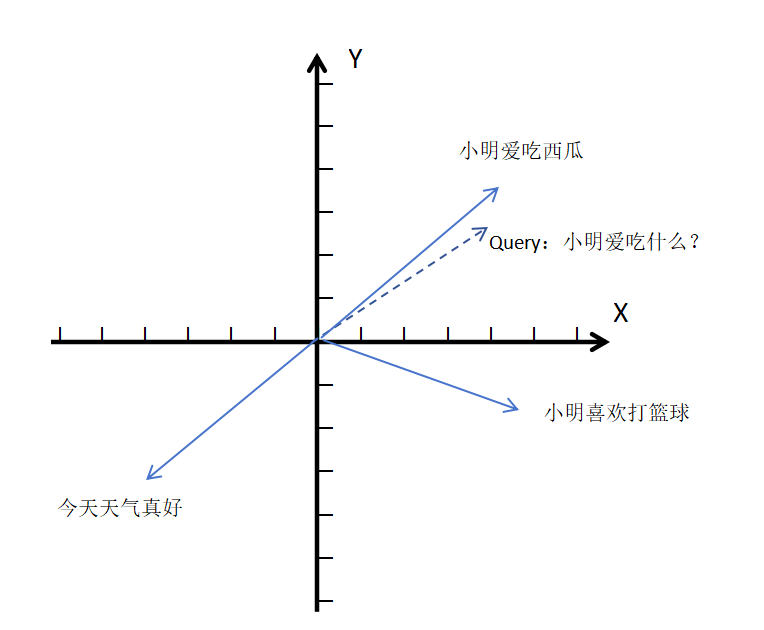 举个例子,以下面这个二维坐标系为例**(实际是多维度,为了演示方便),有三个已有的向量(图中的蓝色实线向量),“小明爱吃西瓜”“小明喜欢打篮球”“今天天气真好**”。我们可以从坐标系中看出,“小明爱吃西瓜”和“今天天气真好”这两个向量是完全不相关的语义,他们的余弦值就接近 -1。“小明喜欢打篮球”这个向量和我们的Query向量(图中的虚线向量)“小明爱吃什么”的夹角较大,说明它们的余弦相似度较低,语义相关程度就比较低。并且我们可以看到Query向量“小明爱吃什么”与“小明爱吃西瓜”的“夹角”非常小,说明两者的余弦相似度接近于 1,更相关。