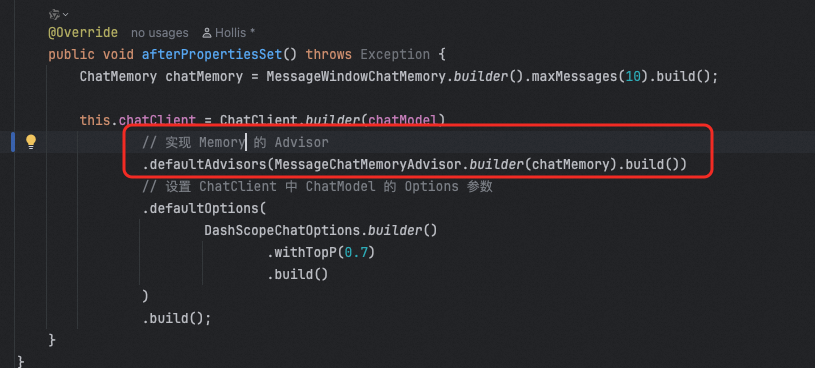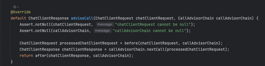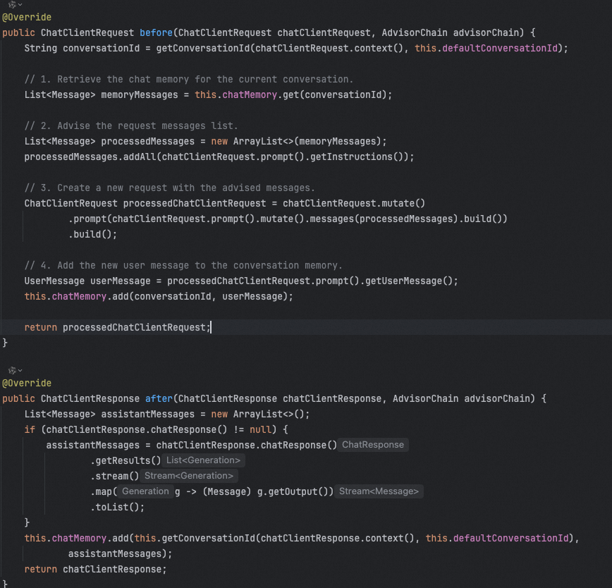 那么也就是说,我们可以自定义advisor的话,如果想在模型调用前或者调用后做一些其他事情,都可以实现这个接口,比如我们前面用到过很多次的MessageChatMemoryAdvisor