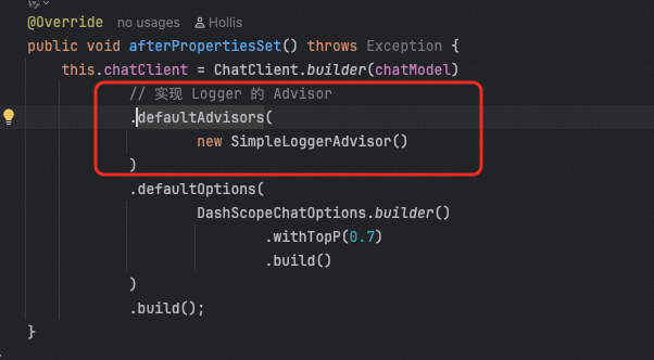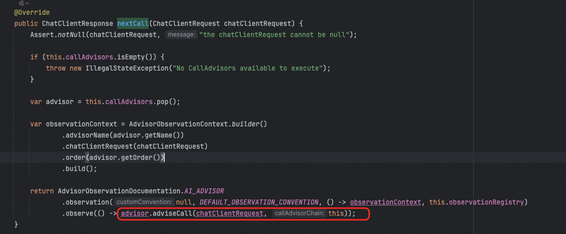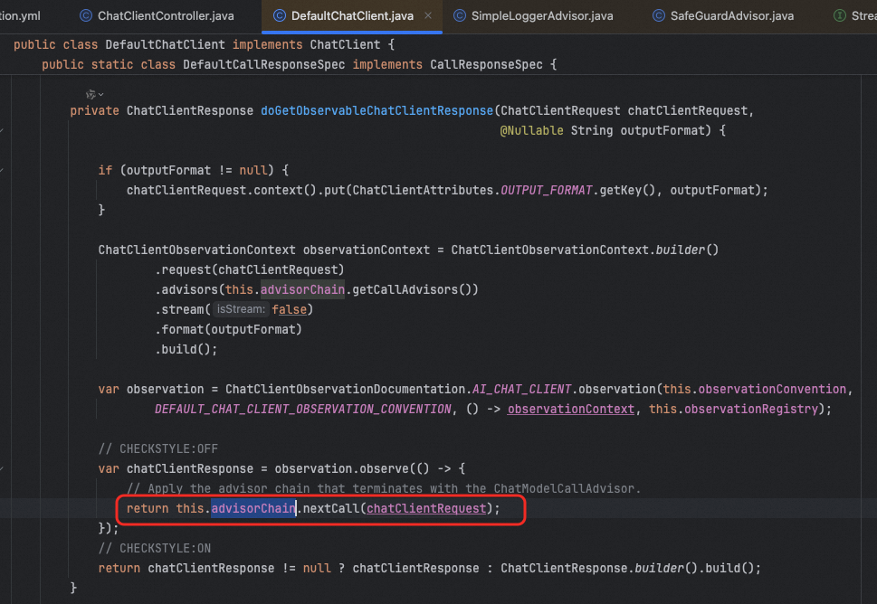 在DefaultChatClient中会有一个advisorChain,这里面就是所有注册进来的advisor,以此调用这些advisor的adviseCall方法。(如果是流式调用,就是调用adviseStream方法)