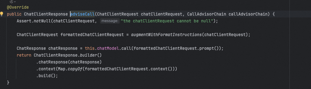 ChatModelCallAdvisor的adviseCall的实现很简单,就是直接调用chatModel的call方法,可以理解为直接和大模型交互了。