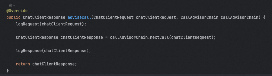 其实就是在调用下一个advisor之前先记录一下request的日志,在调用之后,再记录一下response的日志。