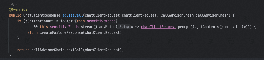 这是一个spring ai内置的安全审查的advisor,其实主要的实现内容就是做敏感词拦截: