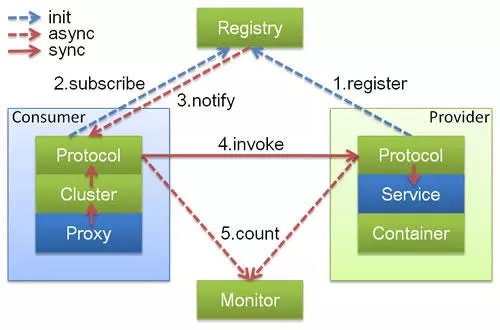 在RPC框架中主要有三个角色:Provider、Consumer和Registry。如下图所示: