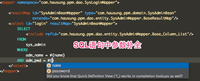 - XML中编辑SQL时, 支持参数自动补全(基于@Param注解识别参数)