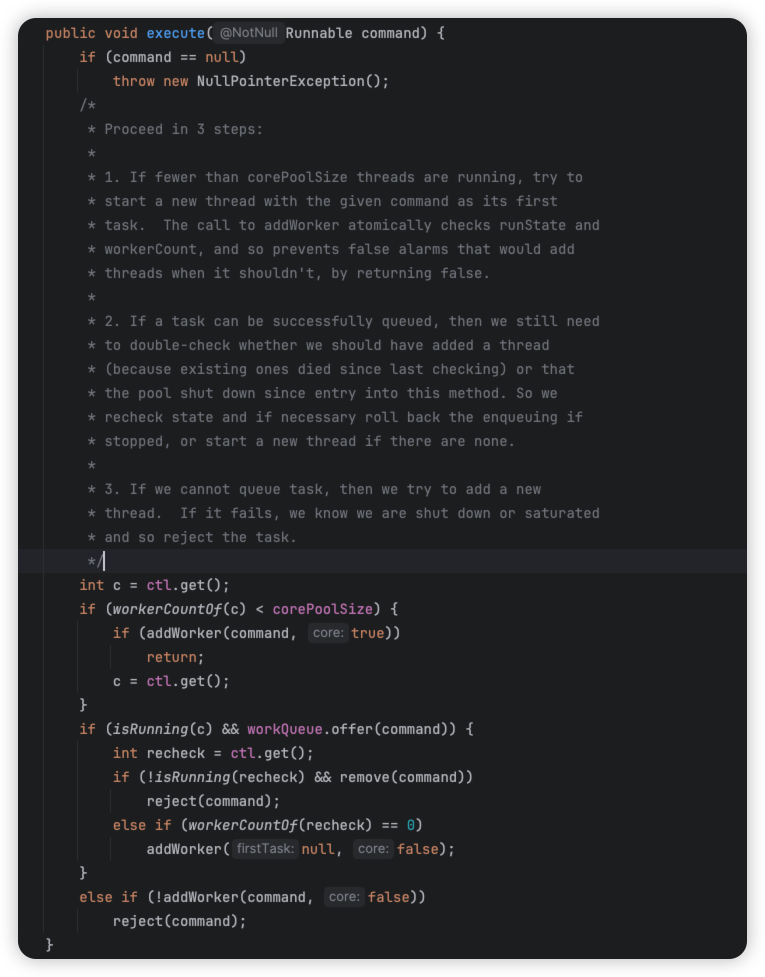 接着,我们看一下线程池中比较重要的execute方法,该方法用于向线程池中添加一个任务。