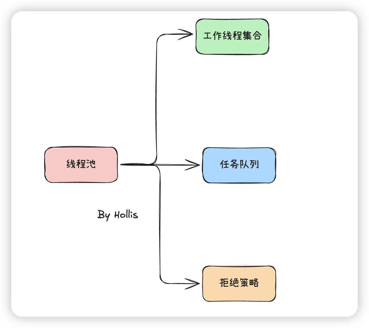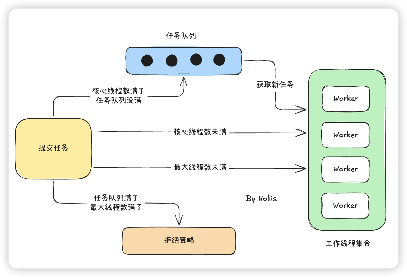 再通过这个流程,我们把前面说过的线程池的三个关键角色串联起来: