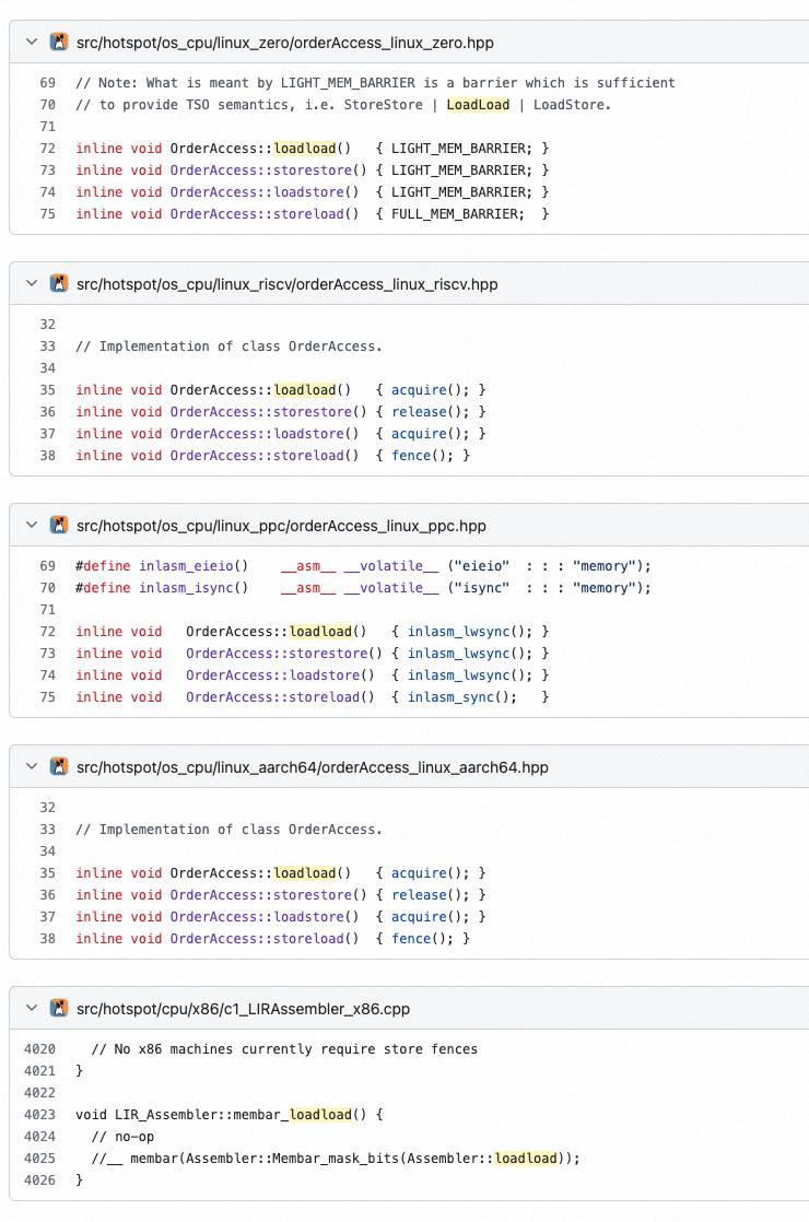 可以看到,针对X86天然支持的loadload、storestore、loadstore这里没有针对CPU做什么特殊的操作,只是调用编译器屏障的代码了。