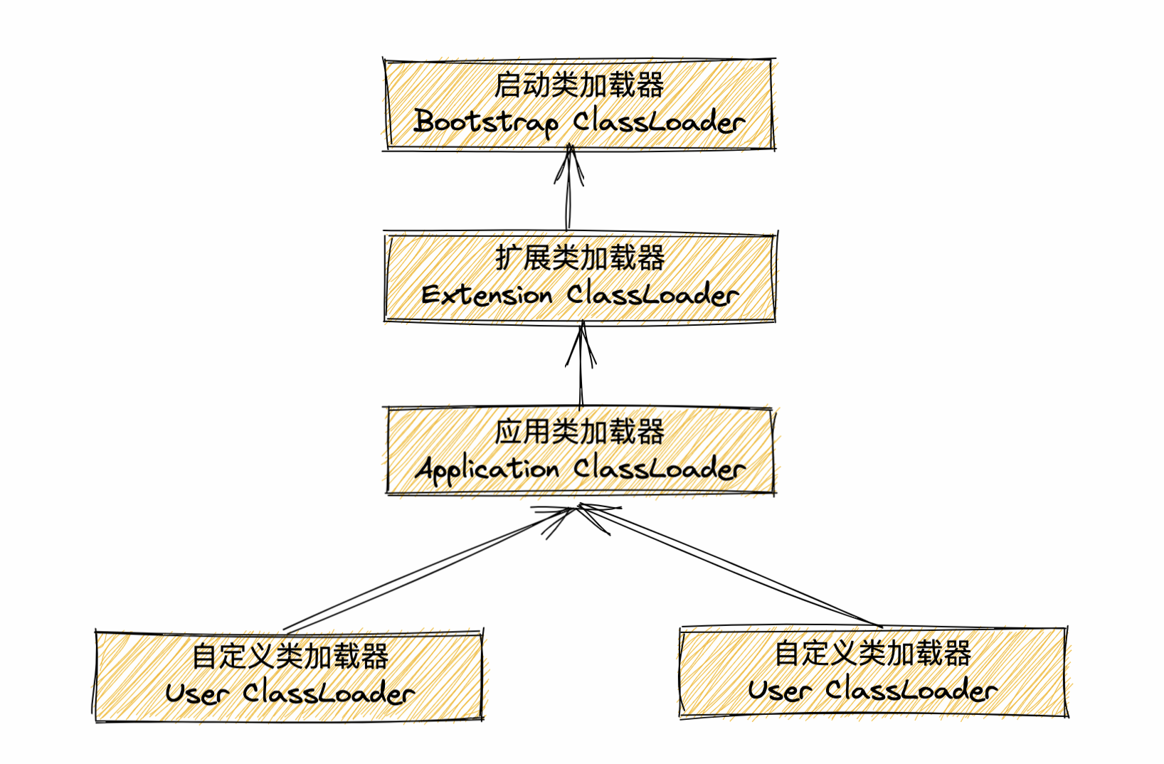 下图中展示的类加载器之间的这种层次关系,称为类加载器的双亲委派模型(Parents Delegation Model)。