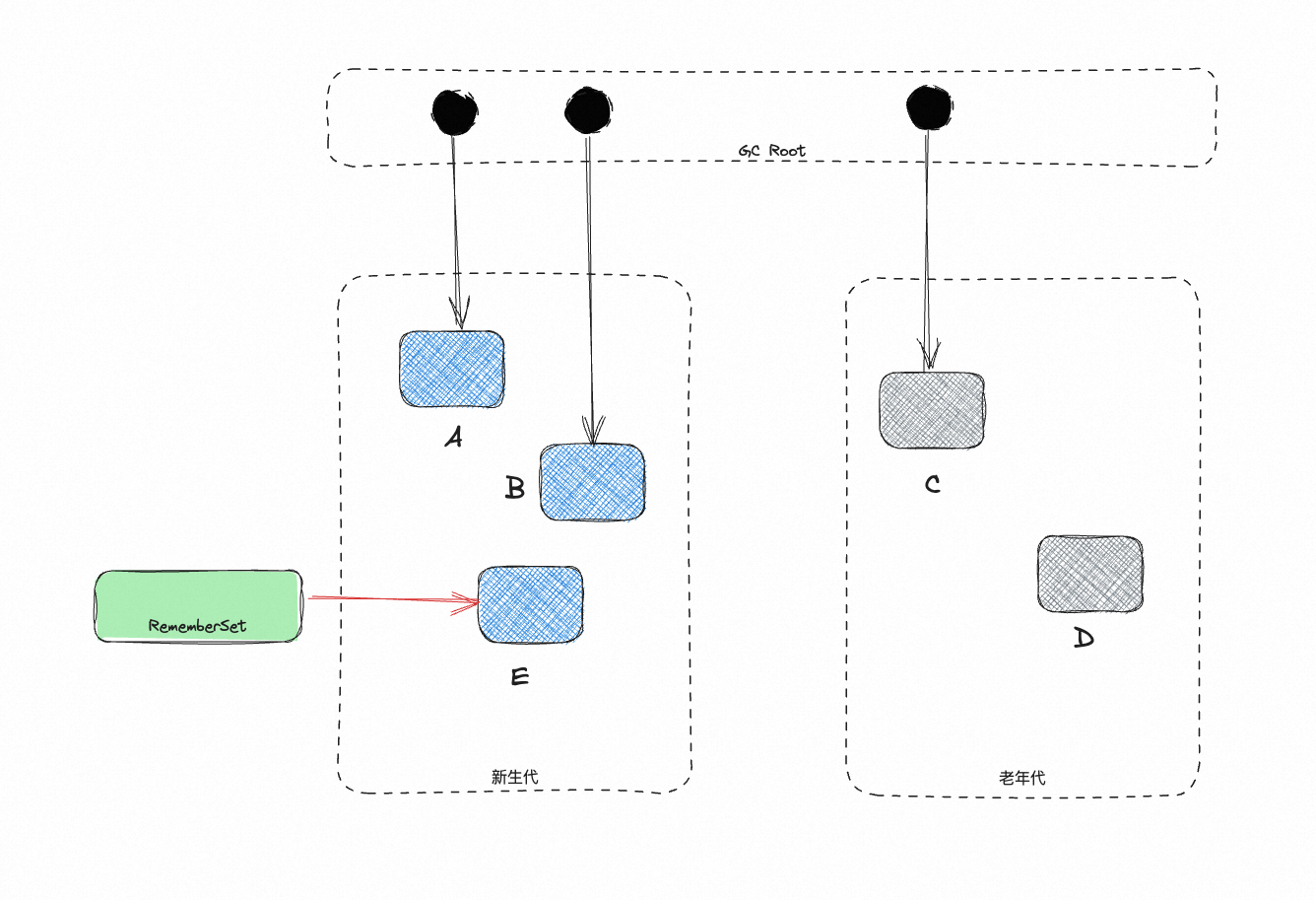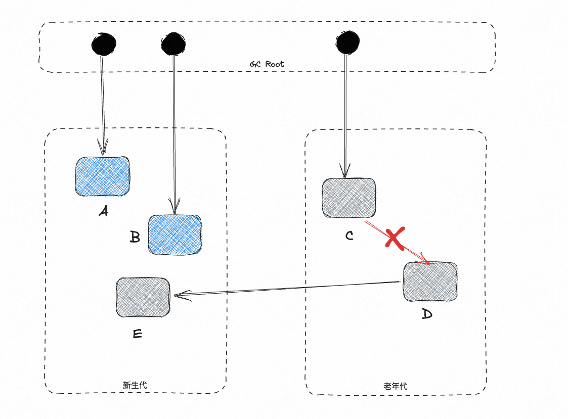 那么这时候,JVM就会认为只有A和B是可达的,就会在接下来的Young GC中把E回收掉,但是其实E是有引用的,只不过他的引用在老年代,发生了跨代引用。