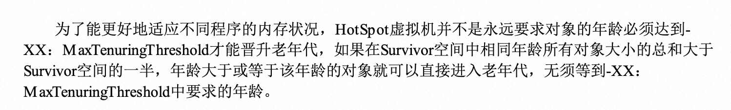 为了能更好地适应不同程序的内存状况,HotSpot虚拟机并不是永远要求对象的年龄必须达到- XX:M axTenuringThreshold才能晋升老年代,他还有一个动态年龄判断的机制。