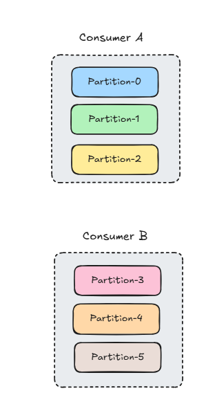 开启了CooperativeStickyAssignor之后,Kafka 通过 两阶段分配 机制实现渐进式重平衡,下面举个例子,假设有一个topic,共6个partition,一个消费者,其中有两个消费者再消费数据:
