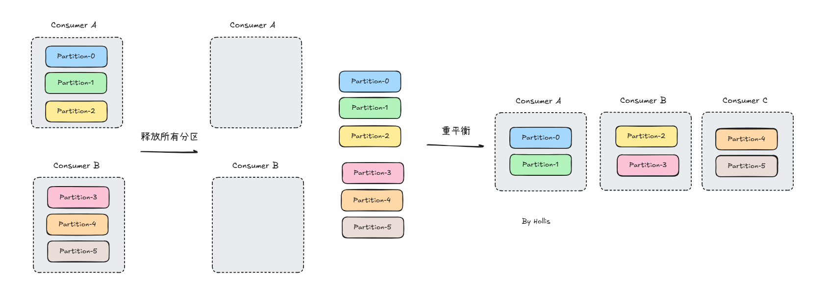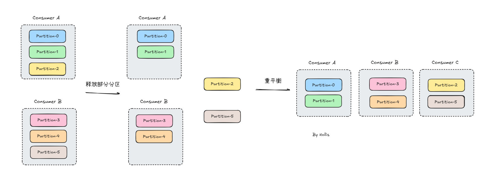 - Kafka 计算 最小变更 方案,并决定 ConsumerA、ConsumerB 各释放一个分区,给 ConsumerC 用。即可能是ConsumerA 释放 Partition-2;ConsumerB 释放 Partition-5