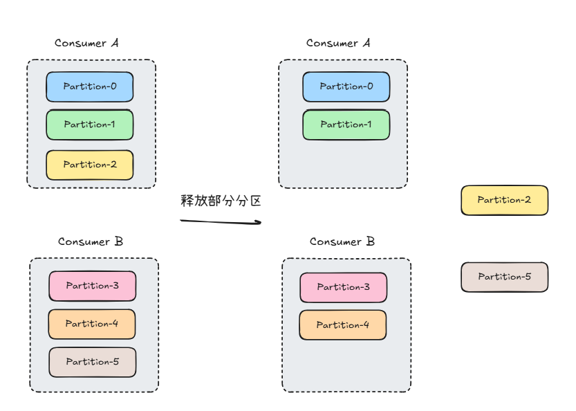 - ConsumerA 和 ConsumerB 不会释放所有分区,而是部分释放。