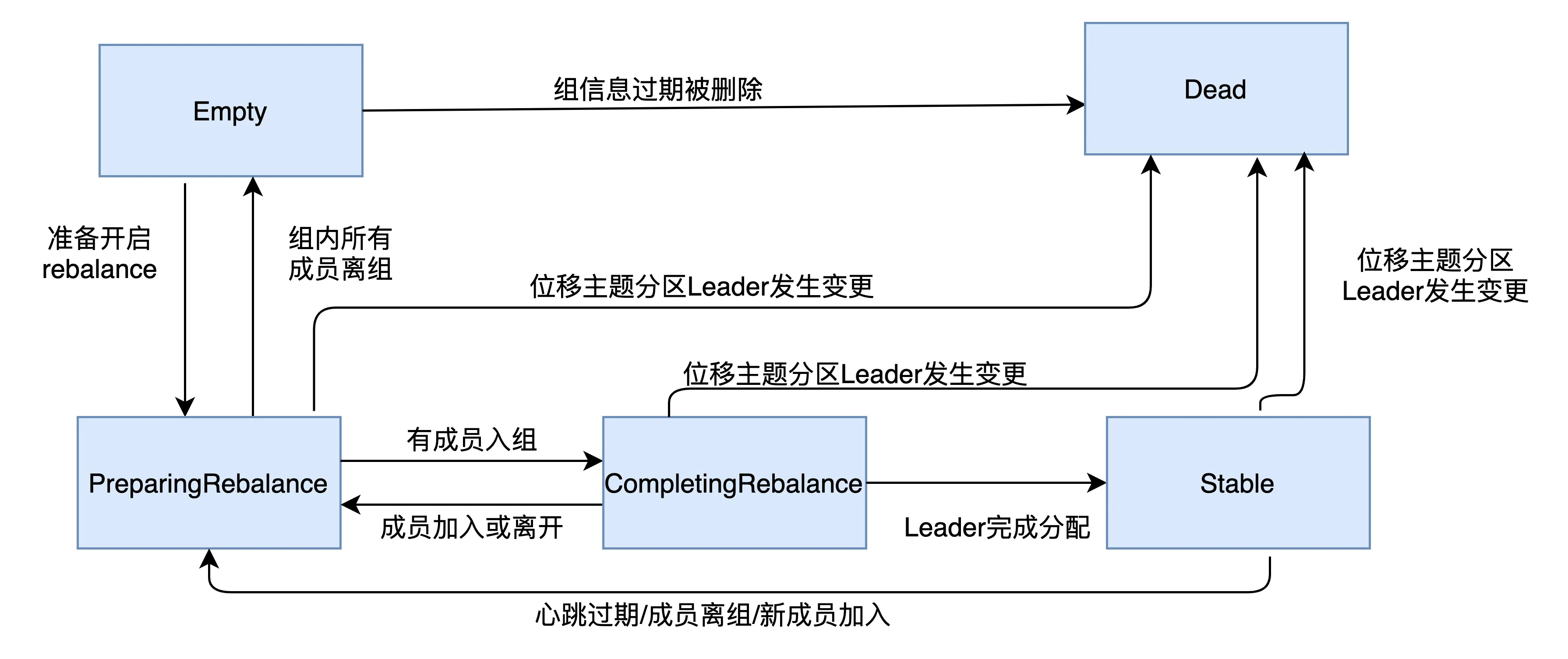 | Empty | 组内没有任何成员,但是消费者可能存在已提交的位移数据,而且这些位移尚未过期 |