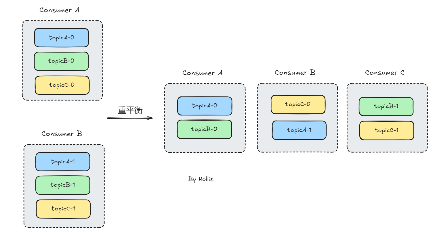 重新分配分区:在消费者重新加入消费者组后,Kafka 集群会将分区分配方案应用到实际的分区分配中,重新分配主题分区给各个消费者。
