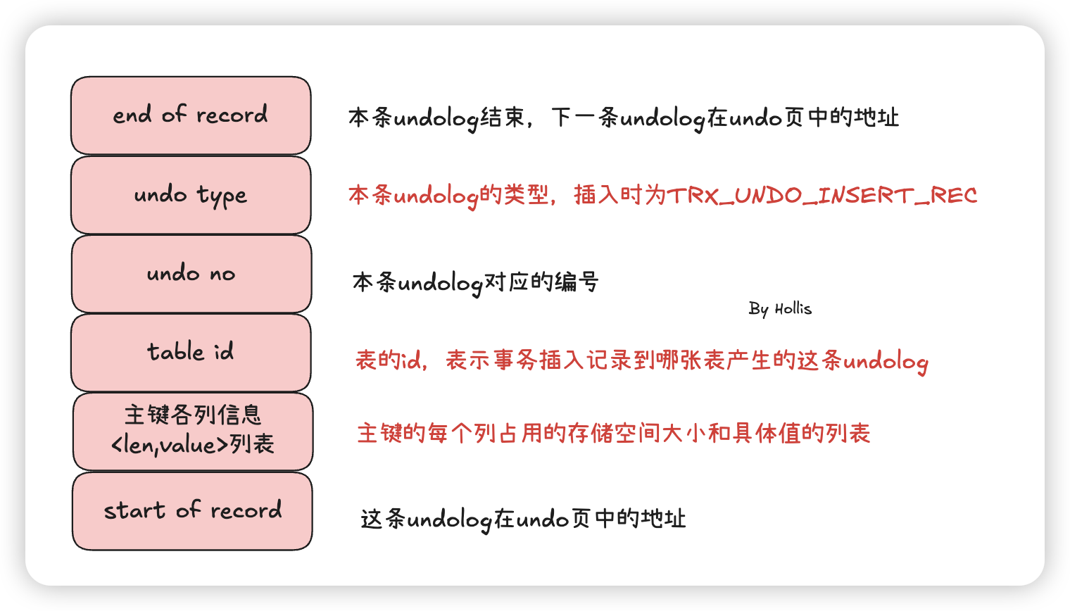 同时存储的重要信息还有undo no、table id、主键各列信息<len,value>列表等。