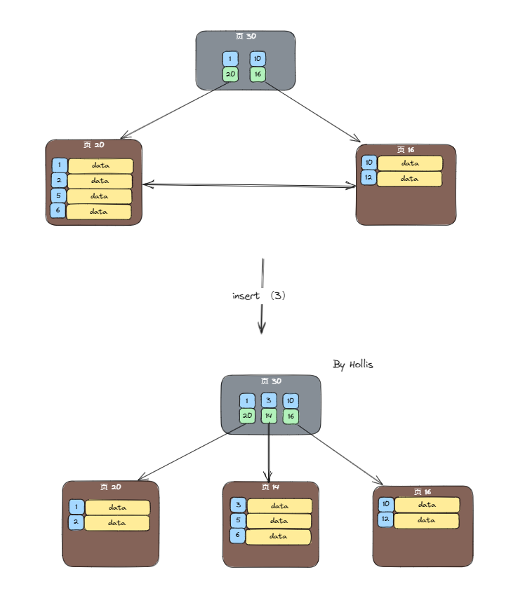 假如,现在我们插入一个新的一条记录,他的索引值是3,那么他就要按照顺序插入到页20中,在索引值为1,2的记录的后面。而如果这个索引页已经满了,那么就需要触发一次页分裂。