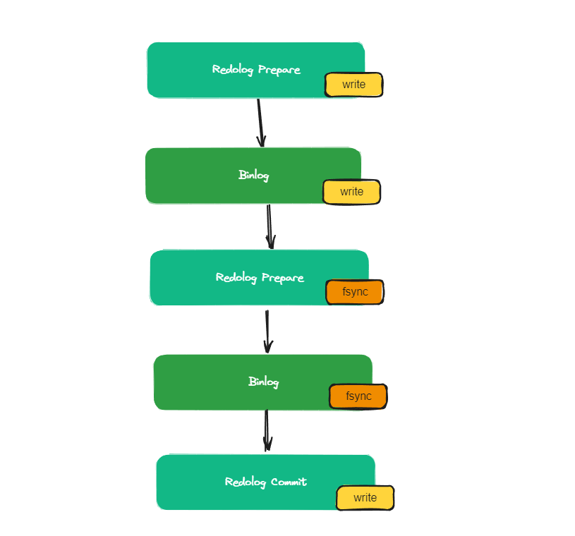 所以,用于将缓冲区内容持久化到磁盘的fsync这一步,被延迟了。他会等一个组中多个事务都处于Prepare阶段后,然后进行一次组提交,即把日志持久化到磁盘中。