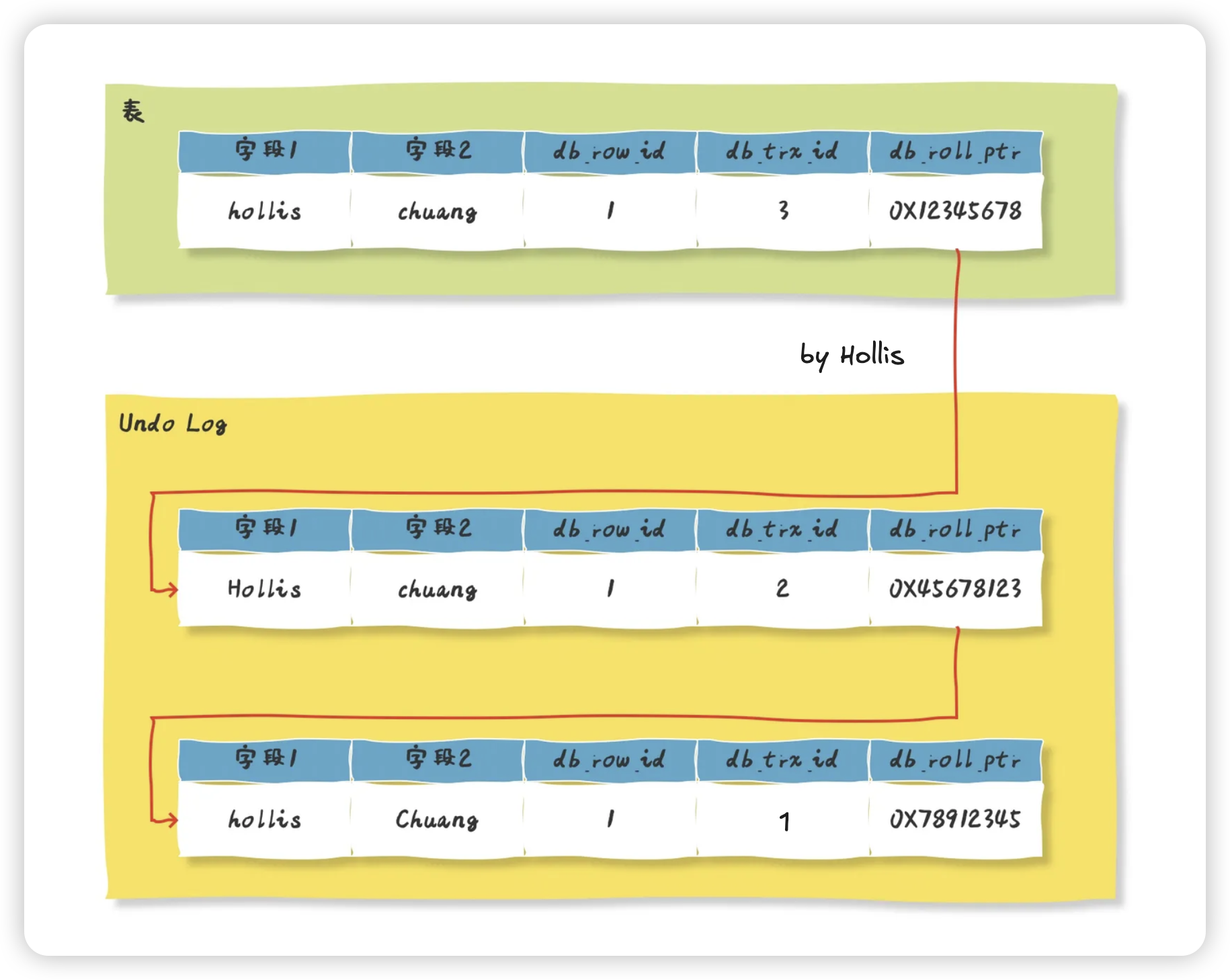 因为每一次记录变更之前都会先存储一份快照到undo log中,那么这几个隐式字段也会跟着记录一起保存在undo log中,就这样,每一个快照中都有一个db_trx_id字段表示了对这个记录做了最新一次修改的事务的ID ,以及一个db_roll_ptr字段指向了上一个快照的地址。(db_trx_id和db_roll_ptr是重点,后面还会用到)