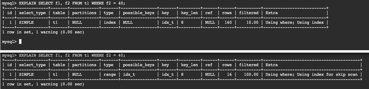 分别在MySQL 5.7.9和MySQL 8.0.30上执行EXPLAIN SELECT f1, f2 FROM t1 WHERE f2 = 40;