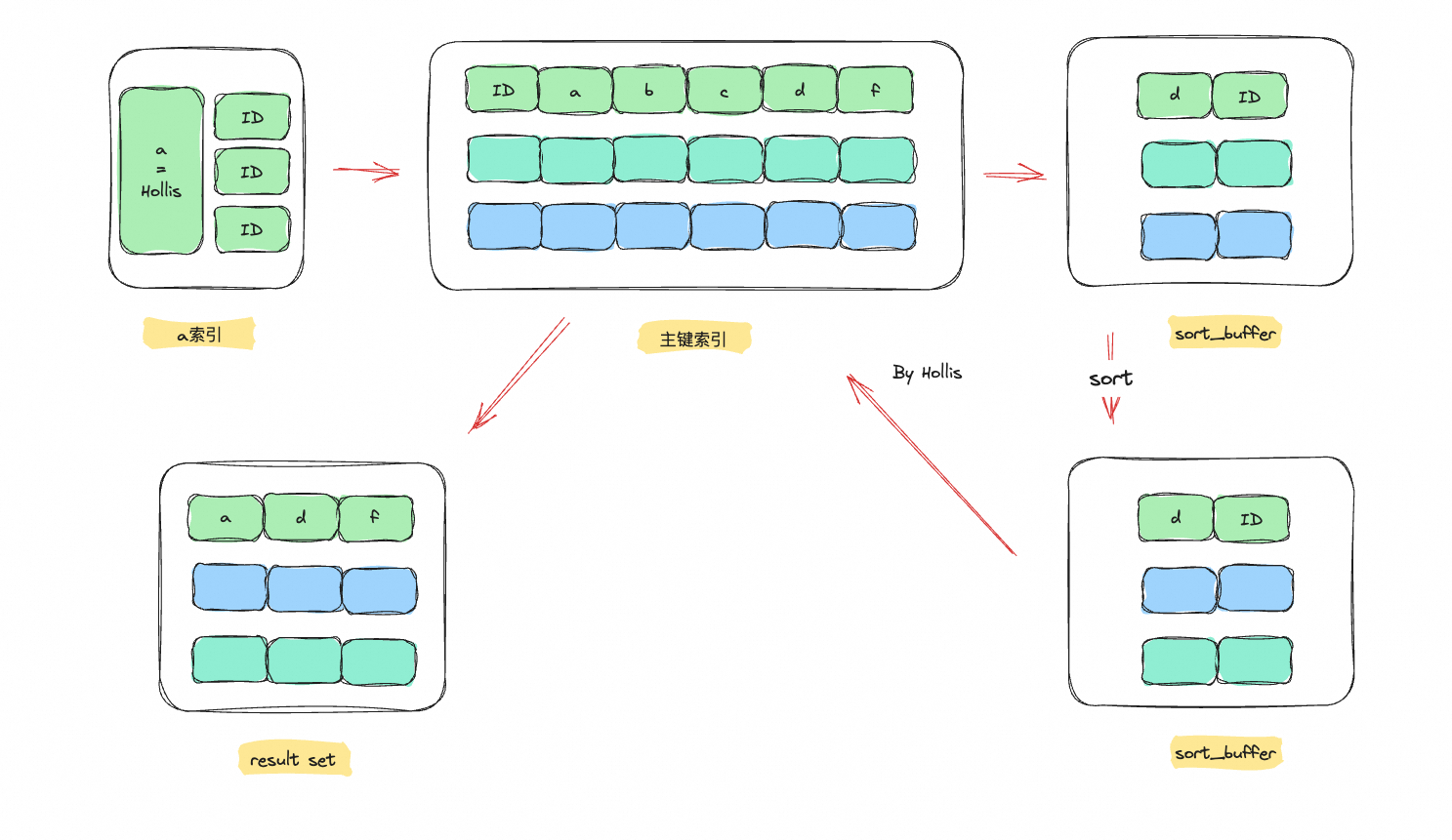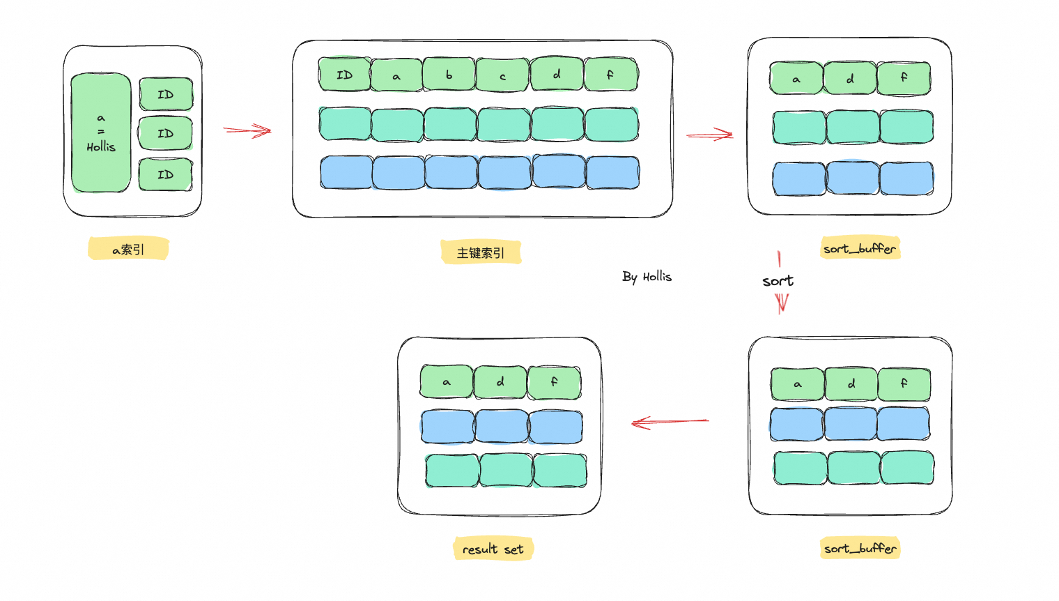 1、从索引a中取出 a = “Hollis"的第一条记录的主键ID