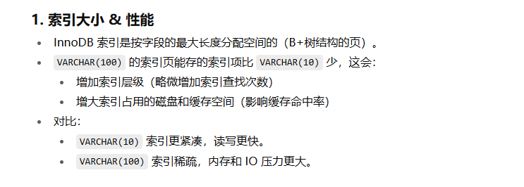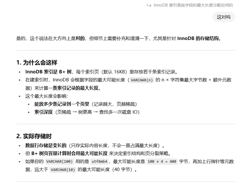 我看到有人提到过, 说varchar的长度会影响索引树的建立,说什么“~~VARCHAR(100)~~~~ 的索引页能存的索引项比 少 ~~”甚至ChatGPT也是这么说的:~~VARCHAR(10)~~