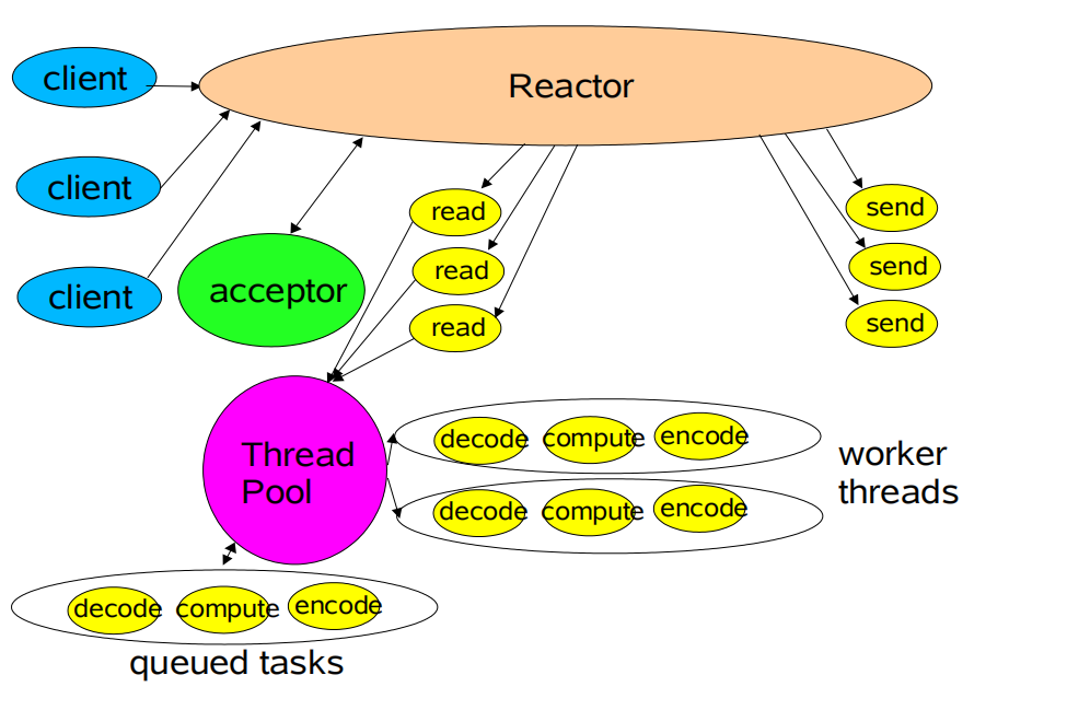 当多个客户端进入服务器后,Reactor线程会监听多种事件(如连接事件,读事件,写事件),如果监听到连接事件,则把该事件分配给acceptor处理,如果监听到读事件,那么则会发起系统调用,将数据写入内存,之后再把数据交给工作线程池进行业务处理。