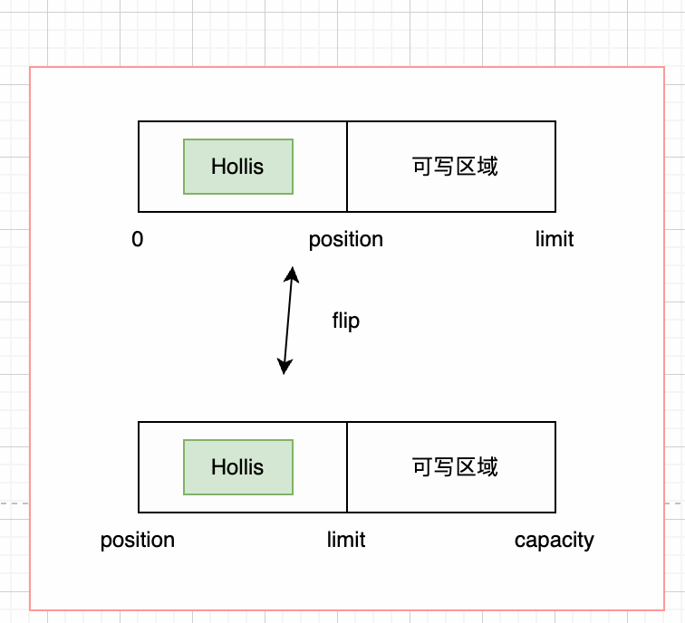 此时,如果我们要从该ByteBuffer中read数据,ByteBuffer会默认从position开始读,这样就什么也读不到,所以我们必须调用#flip方法,将position指针移动,如下: