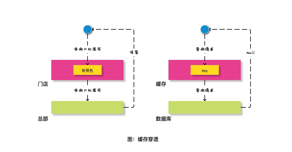 女孩子买口红不仅需要门店帮忙查询,还需要总部也进行盘货。类似这种情况,在缓存领域有一个类似的概念叫做缓存穿透。