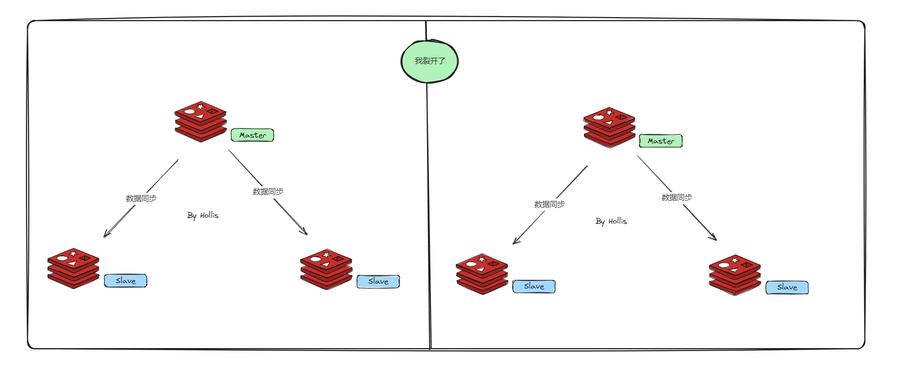 - Master节点,哨兵和Slave节点被分割为了两个网络,Master处在一个网络中,Slave库和哨兵在另外一个网络中,此时哨兵发现和Master连不上了,就会发起主从切换,选一个新的Master,这时候就会出现两个主节点的情况。